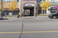 This stock photo captures a quiet residential area in Toronto, Ontario, Canada. The street is paved with asphalt and there is no one in sight. The mixed-use neighborhood features a variety of houses and buildings with different architectural styles. The town has a suburban feel with sidewalks, curbs, and well-maintained lawns. The autumn season is evident with colorful leaves scattered on the road surface. In the foreground, a classic mid-size car and a motorcycle can be seen parked near a beautiful house with a decorative facade and sash windows. The image showcases urban design and captures the essence of city life in Toronto.