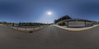 a view looking into the sun over an empty street with some parked cars and an overhang and a building