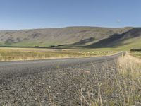 Endless road stretching through the beautiful landscape of rural Iceland. Clear sky contrasts with the lush green grass and vegetation. The road follows the endless slopes of the mountainous terrain.