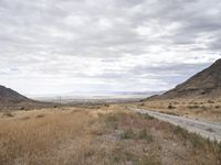 A rugged, elevated road stretching through the highlands of Utah. The endless, dirt road weaves through the stunning desert, surrounded by majestic mountains and wild nature. The grey sky adds a dramatic touch to the natural environment. This landscape captures the essence of rural and wilderness Utah, with its highland hills, gravel tracks, and dryland steppe. In the distance, you can see Salt Lake City, a bustling city amidst this vast and untouched land.