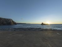 This mesmerizing stock photo captures the serene beauty of a coastal landscape in Europe at dawn. The image showcases a pristine beach with open space, where tranquil waves gently roll onto the shore. The sky is illuminated by the first rays of sunlight, creating a breathtaking afterglow. In the distance, a picturesque headland emerges, providing a stunning profile against the clear sky. The calm water resources and the boat floating in the ocean add a sense of tranquility to this serene scene. A perfect depiction of the natural beauty found in Portugal.
