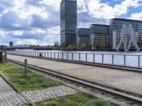 A view of Berlin's metropolitan area with modern office buildings and skyscrapers. The train tracks run alongside a bridge and a lush green landscape. The clock tower stands out among the urban design near the water.