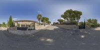 a 360 degree image of a street corner with a driveway, fence, and gate