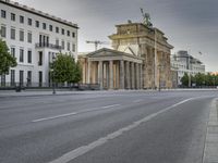 Classic architecture in Berlin, Germany. An empty street leads to two large buildings, with a statue atop a steeple. Clear sky adds to the allure of this vibrant city. A must-see tourist attraction in Europe.