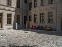 Classic European architecture in Berlin's residential area. Cobblestone streets contrast with modern electric charging stations. Urban design with hard shadows creates a dynamic cityscape. Explore the open courtyards and parkings of Berlin.