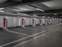 Modern urban design in Berlin, Germany. A cityscape featuring concrete streets, charging stations, and parking lots. Artificial lights illuminate the contemporary architecture under the European sun.
