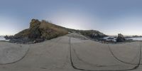 A picturesque coastal landscape in Europe, featuring a small hill resembling a rock formation. The hill is surrounded by clear azure waters and a sandy beach. Rope is wrapped around the hill, adding a touch of intrigue to the scene.