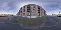 A fish-eye view of a bustling city street in the Netherlands. Modern architecture and traditional brick buildings create a unique urban landscape. Cobblestone roads intersect, surrounded by a mix of residential and commercial properties.