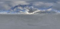 A vast salt flat landscape under a grey sky, showcasing the endless expanse of a desert environment. Open space contrasts with looming clouds, creating a serene yet striking atmosphere at the salt lake.