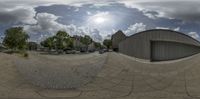 a street full of cars sitting next to a building under a cloudy sky in a fish eye view