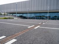 an empty car park at the entrance of a large building with multiple windows and two bars across the street from the parking area