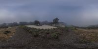 A foggy morning in Los Angeles, California. The photo captures a modern residential area on top of a hill, surrounded by lush vegetation. The grey sky adds an eerie atmosphere to the scene.