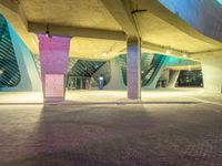 This image showcases a modern cityscape at night, with buildings illuminated by colorful neon lights. The purple concrete pillars create a futuristic architectural design, casting hard shadows on the road surface below. The city's urban design features a bridge, a plaza, and an underpass, all enhanced by artistic lighting. The structure's profile stands out against the dark sky, creating a captivating visual contrast. This photo captures the essence of city life, combining modern architecture, artificial light, and a vibrant atmosphere.