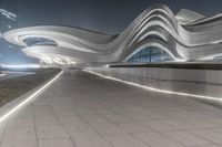 A futuristic city with modern architecture and illuminated roads. The night sky is clear, allowing the artificial lights to create an enchanting atmosphere. The plaza features a music hall and museum, adding to the urban charm.