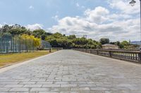 this is a photo of a long brick pathway that runs on a park bench and grass lawn