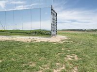 A picturesque rural landscape in Germany under a clear blue sky. The lush, green grass surface is mirrored in the open spaces. Modern architecture and sculptures blend harmoniously with the natural beauty of the field. An artful depiction of Europe's countryside.