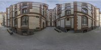 A classic architectural scene in Hamburg, Germany. The symmetrical facades of two buildings are captured through a fisheye lens. Straight down the road, the urban design showcases the city's industrial heritage. A peaceful public space with a bench offers a perfect spot to enjoy city life.