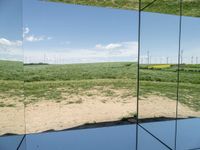A lush green field in rural Germany with a modern wind turbine and a sculptural windmill. The clear sky reflects in a mirror-like surface, highlighting the beautiful landscape. A perfect blend of nature, art, and architecture in Europe.