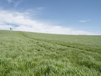 there is grass that has been harvested and planted in rows on a grassy hill by a blue sky