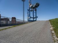 Industrial landscape in Bremerhafen, Germany. Clear sky over an empty lot with a small truck nearby. Tall crane tower dominates the scene. Asphalt road leads to the container port and harbor. A snapshot of Germany's industrial infrastructure.