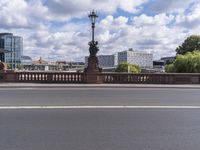 This is an image of the city of Berlin, Germany showcasing a mix of modern and classic architecture. The photo captures a residential area with high-rise buildings, tree-lined streets, and well-designed urban infrastructure. The clear sky contrasts with the cumulus clouds, creating a picturesque scene. A bridge spans over a road surface, while sculptures and statues add artistic elements to the urban landscape. The image also features street lights and vegetation, adding to the overall metropolitan feel of Berlin. This photo highlights the unique blend of architectural styles and urban design found in Europe's diverse capital city, Berlin.