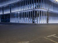 Modern office building in Berlin's business district, showcasing innovative architecture with glass and steel panels. The dark night provides a striking contrast to the illuminated facade. A symbol of Germany's business prowess in Europe.