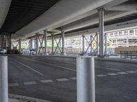A view of a modern cityscape in Berlin, Germany. The urban landscape features futuristic architecture, a network of roads and bridges, and a busy parking garage. Europe's metropolitan area showcases its innovative infrastructure.