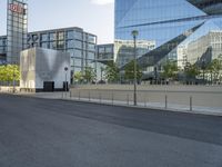 A long road in the heart of Berlin, Germany, surrounded by modern glass buildings. The city's vibrant architecture reflects its dynamic urban design. Clear skies highlight the bustling city life and the business district's headquarters.