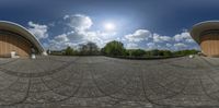 A straight road in Berlin, Germany, lined with modern architecture and open spaces. Clouds cast hard shadows on the urban landscape, creating a dramatic effect. Experience the urban design of Europe's vibrant city life.