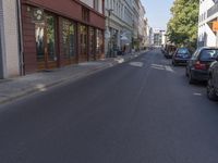 there are several cars parked at the curb of this side street where cars are parked, the buildings have shops on either sides