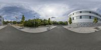 Aerial view of a modern architecture warehouse in Germany. Shadows cast on the multicolored asphalt road leading to the factory. Urban landscape with industrial storage depots and underpasses.