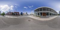 a 360 view lens looking at a view of an empty street and buildings in the background