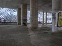a large building with concrete columns and graffiti on the walls and floor inside and under