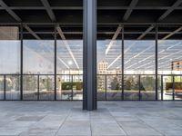 This image showcases modern architecture in Berlin, Germany. The large glass floor and windows offer a view of the courtyard and surrounding trees, creating a sense of openness and connection with nature. The building's facade is a striking feature of the financial district, reflecting the city's urban design. This photo captures the vibrant atmosphere of city life in Berlin, with its business district and museums. The glass surface and modern architecture represent the city's innovative and progressive spirit. This image is a perfect representation of the intersection between urban design and natural surroundings in Berlin.