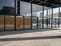 glass walls with a woman walking down the sidewalk in front of it in a public place