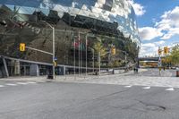 This is an image of a modern office building in Ottawa, Canada. The glass facade reflects the clear sky and adds a futuristic touch to the urban landscape. The building is located in the business district and showcases modern architecture and urban design. The road surface is made of sleek asphalt, lined with street lights and curbs. This photo represents the vibrant city life of Ottawa and its commitment to innovation and business. The combination of glass walls and natural light creates a bright and inviting atmosphere within the building.