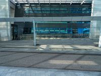 This stock photo captures a modern glassy building entrance in Holland, Netherlands. A bench is seen sitting outside of the building next to a staircase that leads to the entrance. The image showcases urban design and architecture, with tints and shades used in the facade. The road surface, made of asphalt, complements the overall urban atmosphere of the city. This photo represents a perfect blend of modern architecture and city life in Europe's business district.