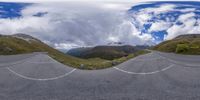 A gloomy day in Austria, with a grey sky hovering over the mountainous landscape. The road, captured through a 360-camera, leads to a parking lot nestled in the natural environment. Explore this scenic destination in Europe.
