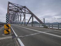 the bridge has yellow signs in front of it while traffic crosses over it on a cloudy day