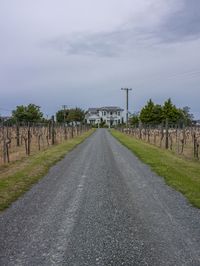 This is an image of a gloomy rural landscape. The photo is taken from a straight down the road perspective, showing the road surface and the surrounding vegetation. The grey sky sets a somber mood, while the grass, dirt, and gravel contribute to the rural aesthetic. In the distance, there is a cluster of houses and land lots, suggesting a small community. The image captures the quiet and peaceful atmosphere of the countryside. It represents a typical day in a rural area, where nature and agriculture coexist.