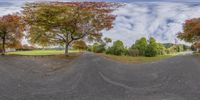 A gloomy day in the rural landscape. The road, asphalt and low clouds create a somber atmosphere. The park, filled with deciduous trees, offers a peaceful escape. Incidental people can be seen walking along the road.