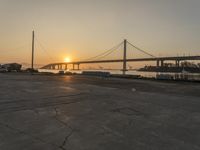 the sun is setting behind a bridge over water and boats docked on the dock and in the bay area