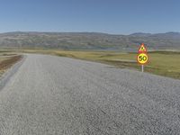 This stock photo showcases a scenic gravel road in Iceland, surrounded by beautiful natural landscapes. The road, made of gravel and asphalt, cuts through a grassy plain with magnificent mountains in the background. The clear sky and abundance of vegetation add to the picturesque view. A speed limit sign indicating 65 degrees down the road serves as a reminder for safe driving. This image captures the natural environment of Iceland, a stunning island located in Europe.