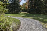 This stock photo features a scenic view of a gravel road surrounded by trees in autumn. A single red pickup truck is driving down the road. The vibrant colors of the leaves and the lush green grass create a beautiful landscape. The sunlight filters through the branches, illuminating the path ahead. This scenic spot is located in Ontario, Canada, providing a relaxing and peaceful atmosphere. The image captures the natural beauty of the area, making it perfect for any nature-related project or advertisement.