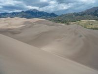 A gloomy day at the Great Sand Dunes Nationalpark in Colorado. The grey sky casts a somber tone over the open space, with the sand dunes stretching out into the desert landscape. Majestic mountains loom in the background, adding to the natural beauty of this USA destination.