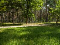a forest with some green grass near dirt road and trees on the other side and bushes all around it