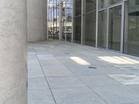Grey Sidewalk with Large Glass Windows and Stone Pillars