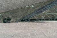 In the bustling city of Guangzhou, China, a stunning glass wall stands against a clear sky. Futuristic architecture meets modern cityscape. People stroll along the open space, with stairs leading to a concrete surface.