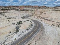 High position aerial view of an asphalt road in rural Utah. The landscape features stunning natural formations such as Head of the Rocks. Clouds dot the clear day sky, creating a picturesque scene.