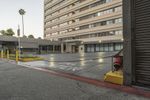 Modern architecture in Los Angeles, California. High-rise building surrounded by a large parking lot. Open space and trees provide shade. A bustling urban area with a mix of residential and commercial properties.